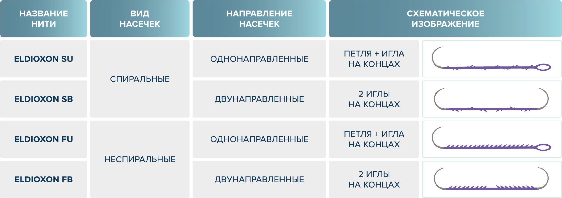 основные конфигурации атравматического шовного материала ELDIOXON SU | SB | FU | FB